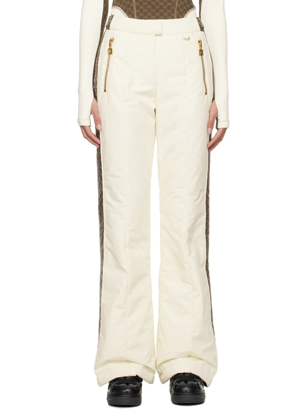 Flared insulated polyester taffeta pants. · High-rise · Adjustable press-stud tabs at waist · D-ring at waist · Four-pocket styling · Zip-fly · Central seam at legs · Jacquard logo canvas trim at outseams · Zip expansion panel at cuffs · Inset elasticized cuffs · Full taffeta lining · Gold-tone hardware Supplier color: Creme/Marron Body 1: 100% polyester. Body 2: 84% polyamide, 16% acetate. Fill: 100% polyester. Lining 1: 100% polyester. Lining 2: 100% cotton. Made in Italy 241251F521000