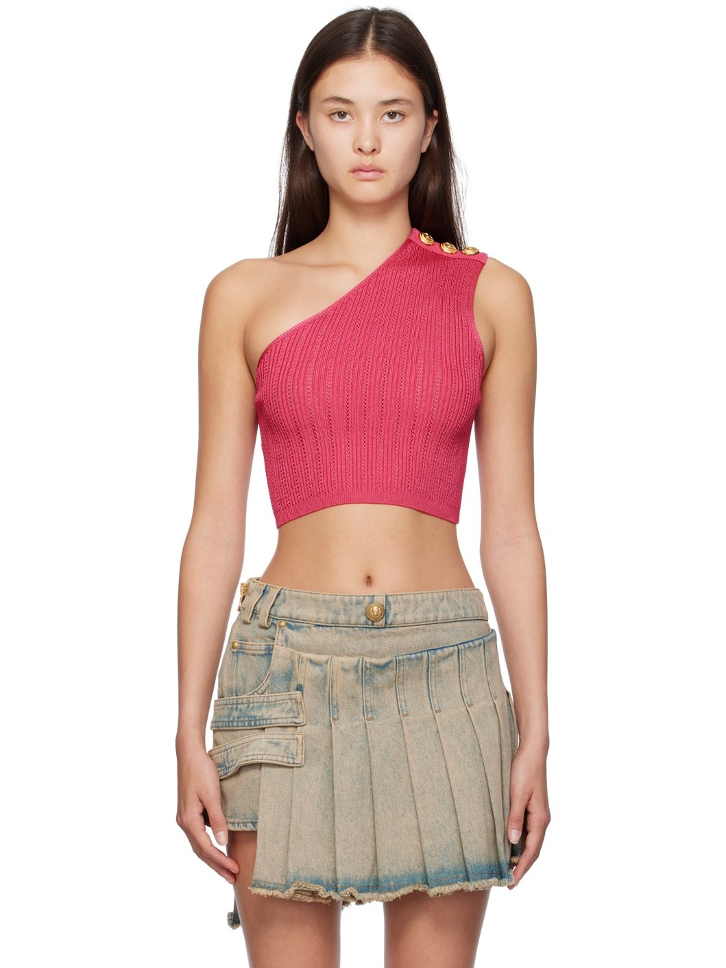 Rib knit viscose-blend tank top. · Asymmetric single-shoulder construction · Engraved button hardware at shoulder Supplier color: Rose fuchsia 83% viscose, 17% polyamide. Made in Italy 231251F111032