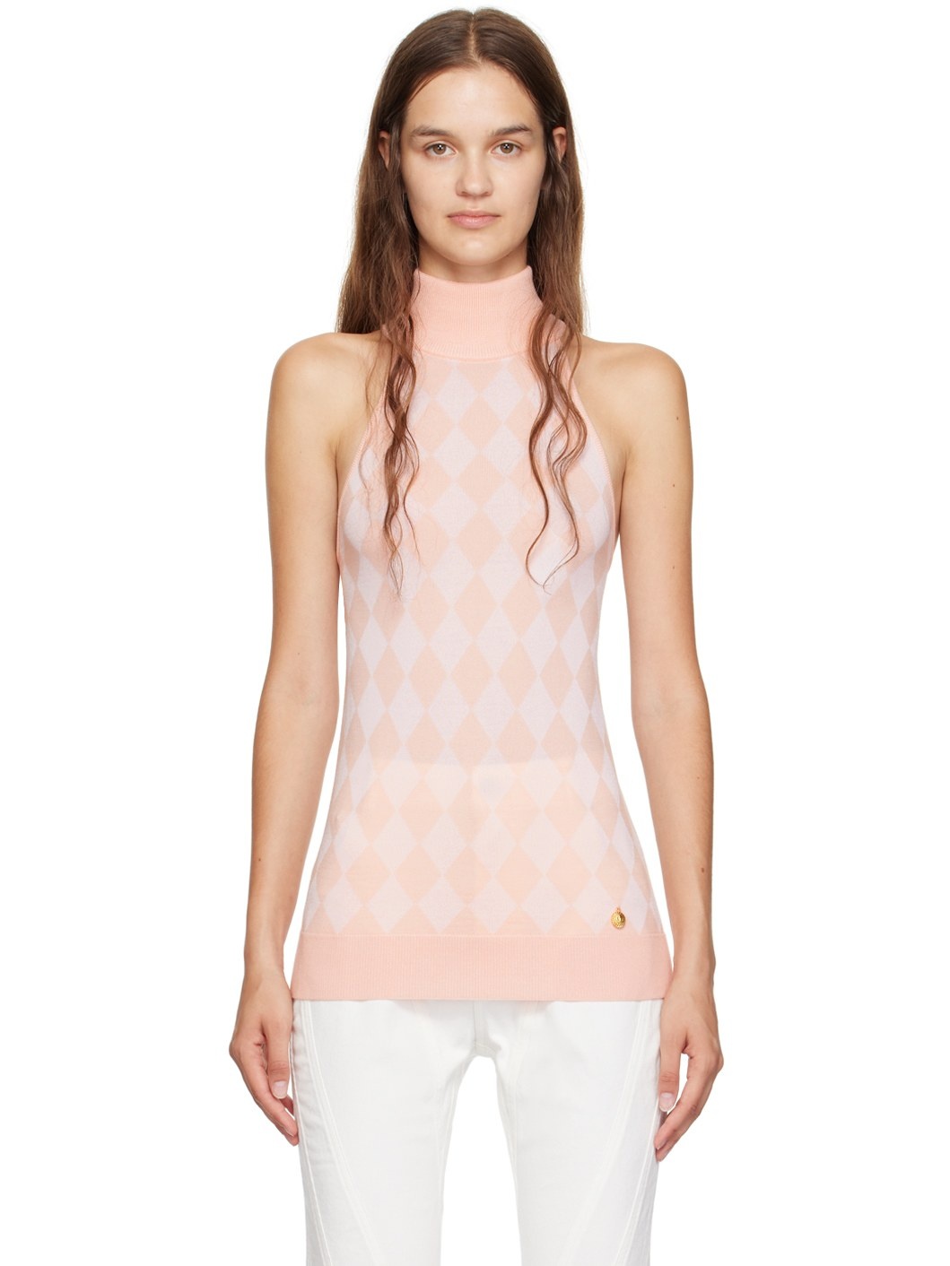 Knit wool- and viscose-blend tank top. Jacquard check pattern throughout. · Rib knit mock neck, hem, and armscyes · Logo hardware at hem Supplier color: Saumon/Rose 62% wool, 35% viscose, 3% polyester. Made in France 242251F111010