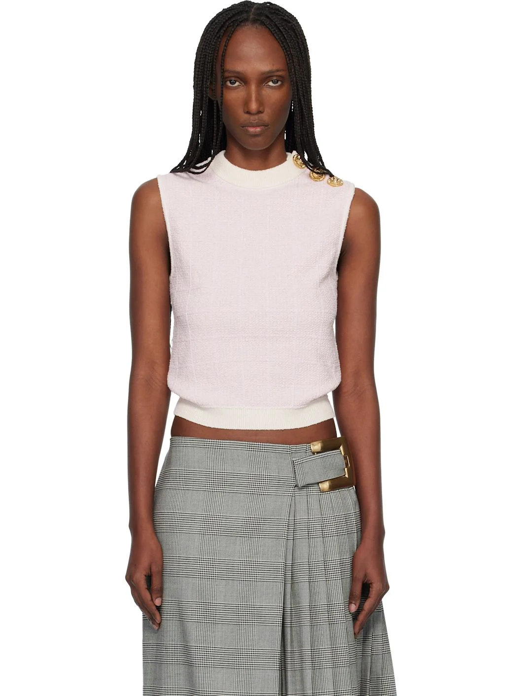 Cotton-blend tweed tank top. · Metallic threads and check pattern throughout · Rib-knit crewneck, hem, and armscyes · Gold-tone graphic hardware at shoulder Supplier color: Rose Pale/Nature Body: 44% cotton, 27% viscose, 21% polyamide, 6% polyester, 1% metallic polyester, 1% elastane. Trim: 45% viscose, 27% cotton, 18% polyamide, 9% polyester, 1% elastane. Made in France 261251F111000
