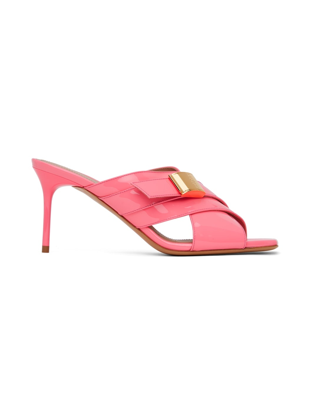 Patent calfskin mules in pink. · Open square toe · Logo-engraved hardware at criss-crossing straps · Logo stamp at buffed calfskin footbed · Buffed calfskin lining · Covered stiletto heel with rubber injection · Leather sole · Heel: H3" Supplier color: Bubble gum Upper: calfskin. Sole: leather. Made in Italy 241251F125001