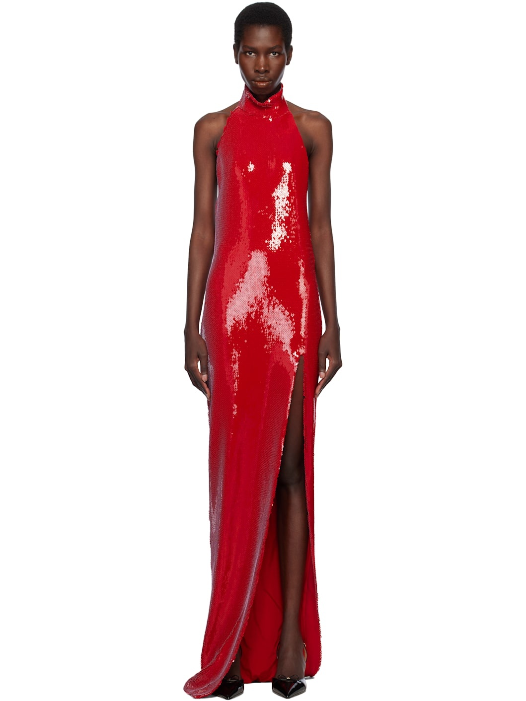 Sequinned stretch polyester mesh maxi dress. · Hook-eye fastening at halter neck · Slit at front hem · Self-tie straps at open back · Draped low back · Full stretch silk satin lining Supplier color: Red Body 1: 85% polyamide, 5% elastane. Body 2: 100% viscose. Trim: 100% polyester. Lining: 96% silk, 4% elastane. Made in France 251251F055003