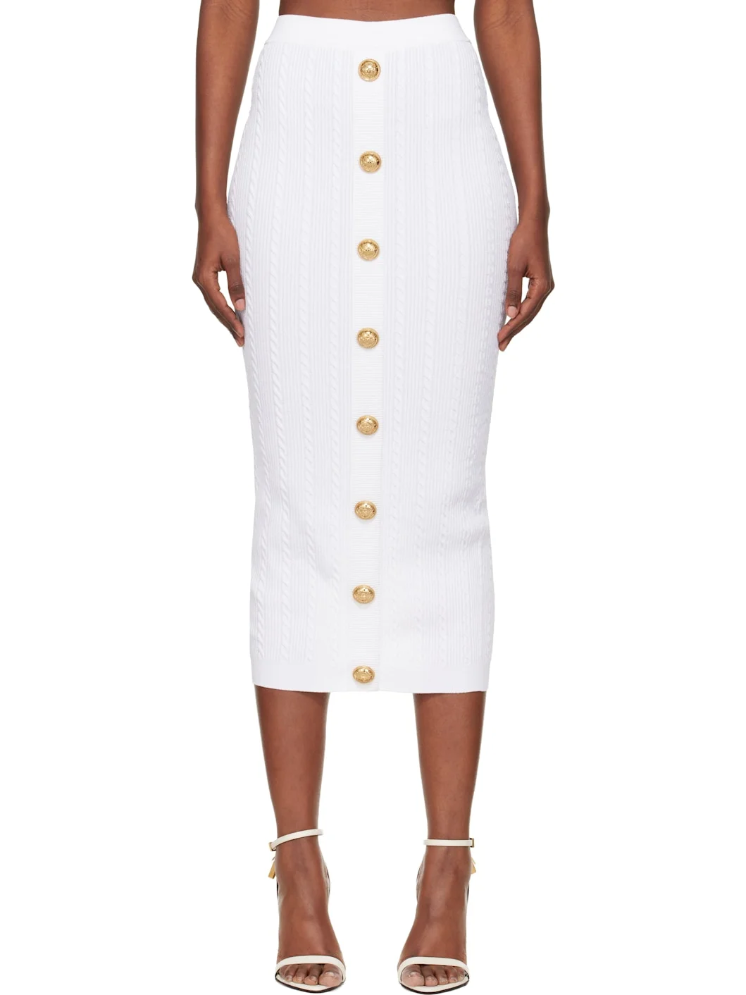 Cable-knit viscose-blend midi skirt. · Rib-knit trim throughout · Elasticized waistband · Button hardware at front · Two-way zip closure at back · Engraved gold-tone hardware Supplier color: Blanc 83% viscose, 17% polyester. Made in France 252251F092001