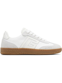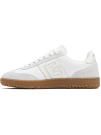 Low-top calfskin suede and cotton canvas sneakers. · Serrated edges throughout · Lace-up closure · Logo stamp at padded tongue · Padded collar · Logo patch at sides · Logo stamp at outer side and heel tab · Buffed leather lining · Treaded rubber sole Supplier color: White Upper: calfskin, textile. Sole: rubber. Made in Italy 252251F128002