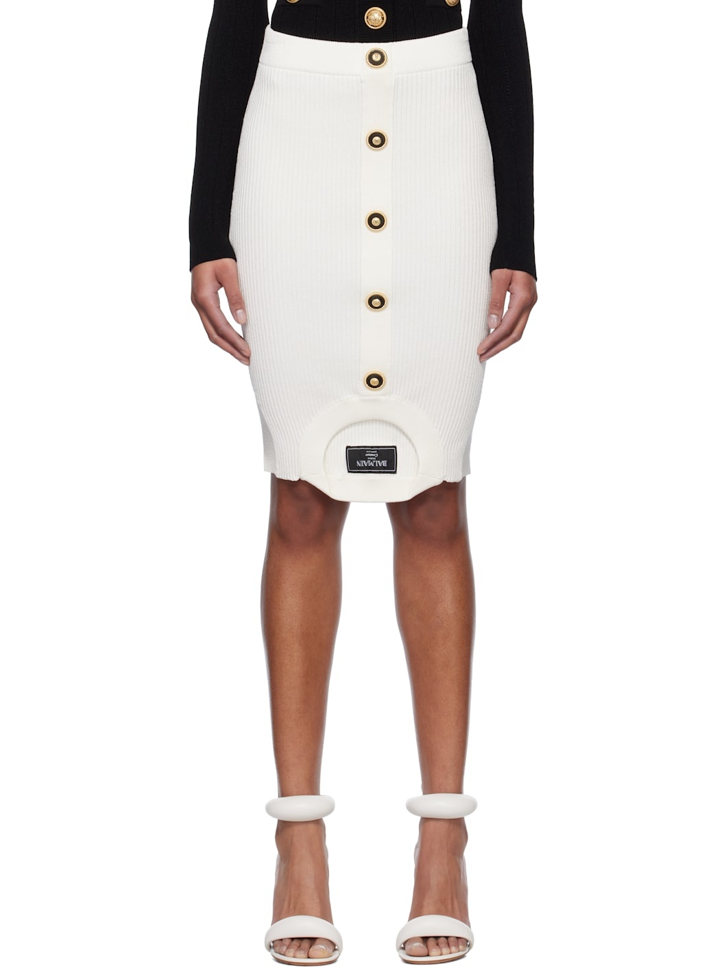 Rib-knit viscose-blend miniskirt. · High-rise · Elasticized waistband · Mock button closure · Crewneck, logo patch, and armscyes at hem · Logo-engraved gold-tone hardware Supplier color: Blanc 84% viscose, 16% polyester. Made in Italy 251251F090004