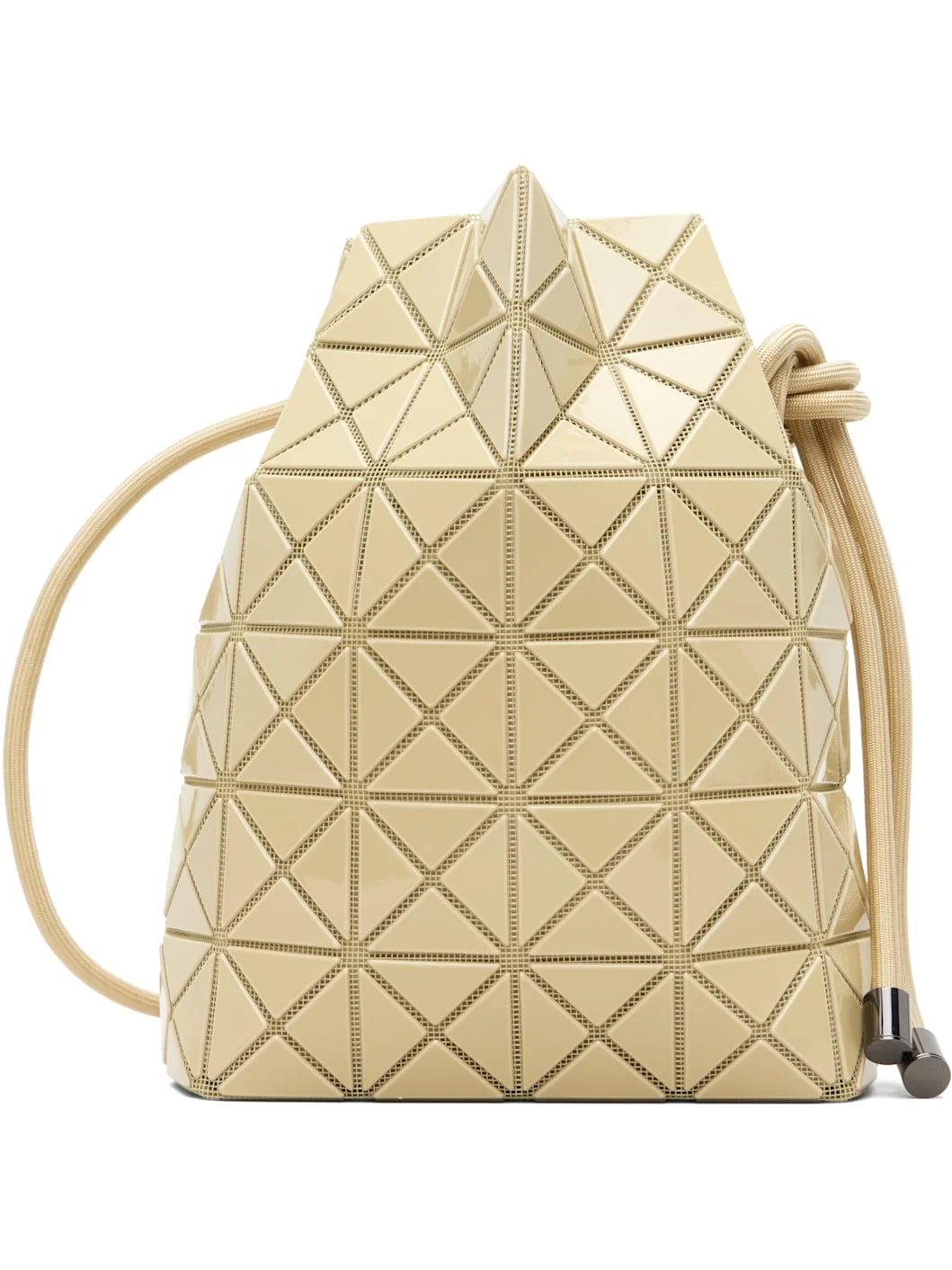 Mesh shoulder bag. · Signature triangular vinyl appliques throughout · Adjustable drawstring shoulder strap · Open throat · Zip pocket at interior · Logo-embossed canvas lining · Gunmetal-tone hardware · H9.25" x W6.25" x D3" Supplier color: Yellow beige Body: 100% polyester. Trim 1: 100% polyvinyl chloride. Trim 2: 100% nylon. Lining: 100% nylon. Made in Japan 261730F048000