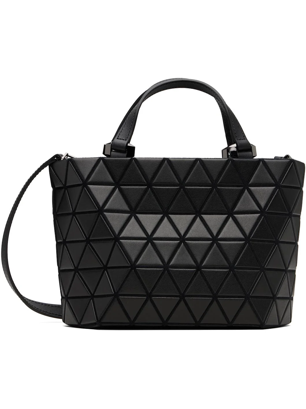 Faux-suede top handle bag. · Signature triangular vinyl appliques throughout · Twin carry handles · Adjustable and detachable crossbody strap · Zip closure · Patch pockets at interior · Logo-woven canvas lining · H6.5" x W11" x D4.5" Supplier color: Matte Black Synthetic, polyvinyl chloride. Made in Japan 261730F046014