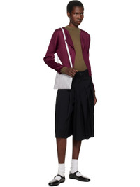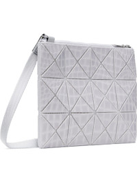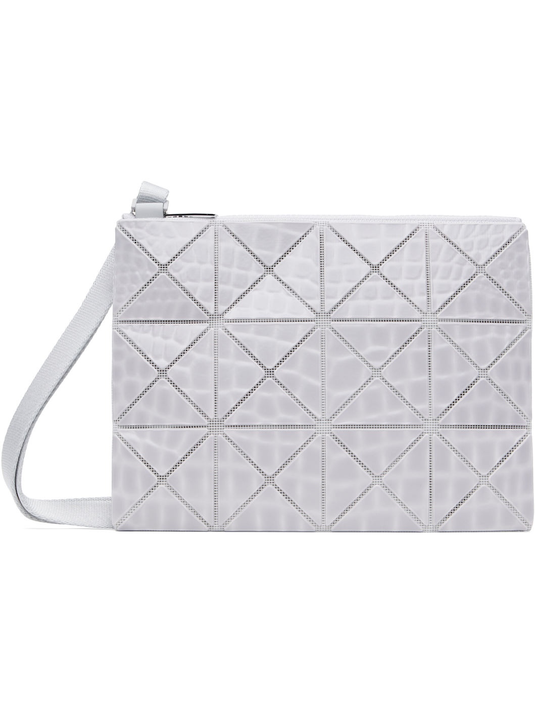 Mesh shoulder bag in white. Croc-embossed signature triangular vinyl appliques in gray throughout. · Adjustable webbing crossbody strap · Zip closure · Logo-woven canvas lining · H7" x W9" x D0.25" Supplier color: Gray Polyvinyl chloride, textile. Made in Japan 252730F048020