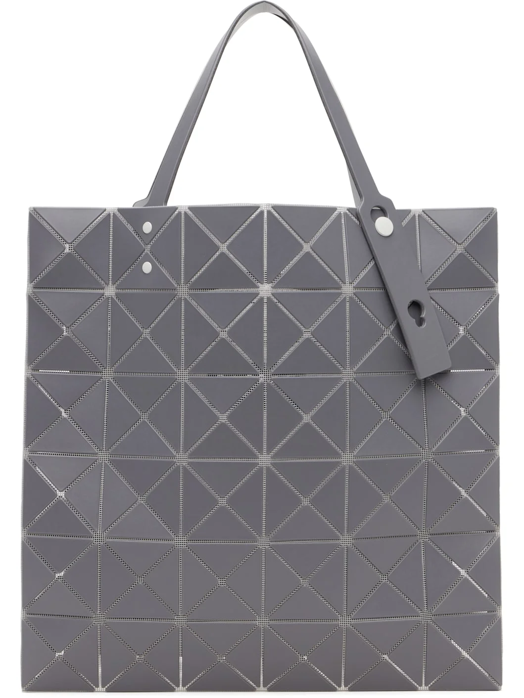 Mesh tote. · Signature triangular vinyl appliques throughout · Adjustable carry handles · Open throat · Zip pocket at interior · H13.5" x W13.5" Supplier color: Dark Grey/Light Grey Textile, polyvinyl chloride. Made in Japan 261730F049021