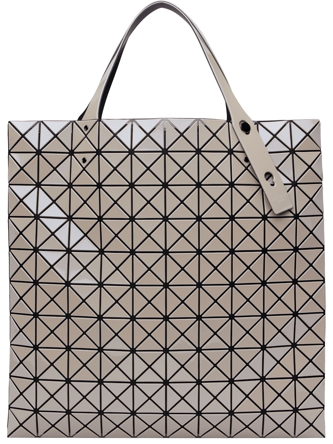 Mesh tote in black. Signature triangular vinyl appliques in metallic gray throughout. · Adjustable twin shoulder straps · Open throat · Zip pocket at interior · Unlined · H15.5" x W15.5" Supplier color: Greige Polyvinyl chloride, textile. Made in Japan 252730F049012
