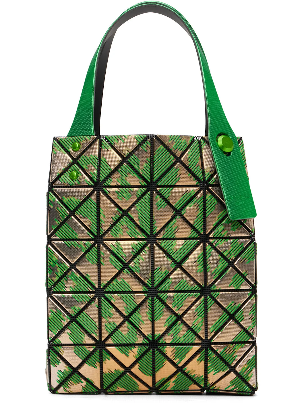 Mesh top handle bag. · Signature triangular rubber appliques throughout · Graphic pattern printed throughout · Adjustable shoulder straps · Magnetic press-stud closure · Patch pocket at interior · H7.75" x W6.5" x D1.5" Supplier color: Green Textile, polyurethane, polyvinyl chloride. Made in Japan 261730F046000