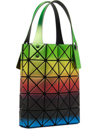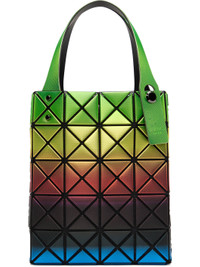 Mesh tote in black. Signature triangular vinyl appliques in metallic multicolor throughout. · Adjustable twin carry handles · Press-stud closure at open throat · Patch pocket at interior · Unlined · H7.75" x W6" x D1.5" Supplier color: Light green base Polyvinyl chloride, textile. Made in Japan 251730F049007