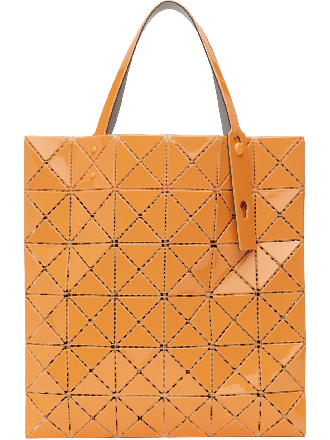 Sheer mesh tote in orange. · Triangular glossy polymer appliques throughout · Twin adjustable faux-leather carry handles · Zip pocket at interior · Unlined · H13.5" x W13.5" Supplier color: Orange Textile, polyvinyl chloride. Made in Japan 252730F049004