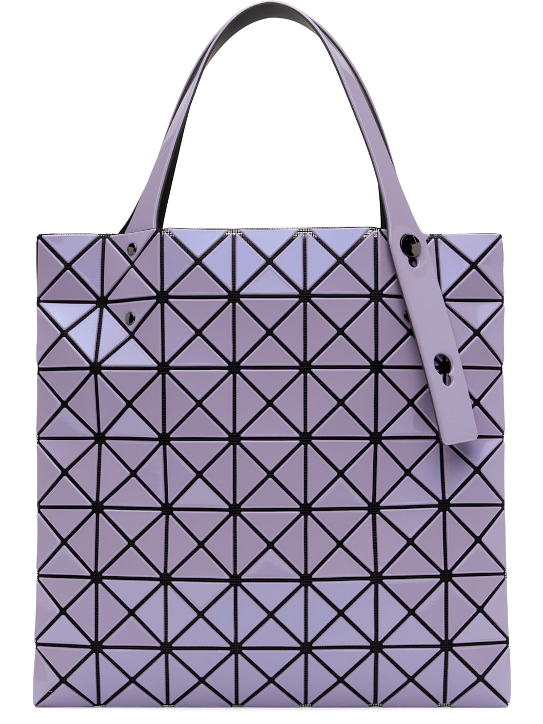 Mesh tote in black. · Signature triangular vinyl appliques in purple throughout · Adjustable shoulder straps · Open throat · Zip pocket at interior · H11" x W11" Supplier color: Lavender Polyvinyl chloride, textile. Made in Japan 252730F049013