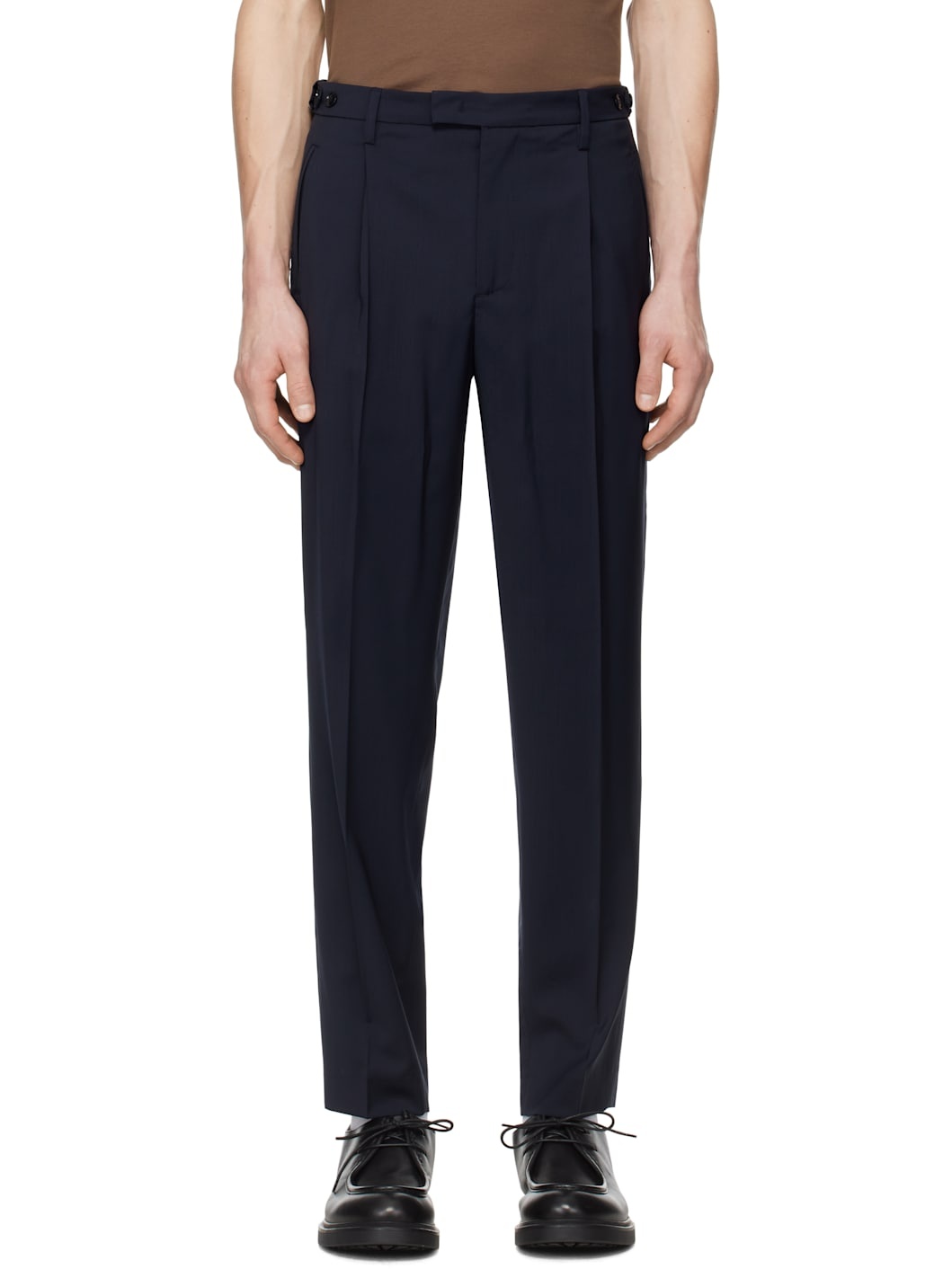 Tropical wool barathea trousers. · Belt loops and button tabs at waistband · Four-pocket styling · Zip-fly · Creased legs Supplier color: Navy 100% wool. Made in Italy 251313M191018
