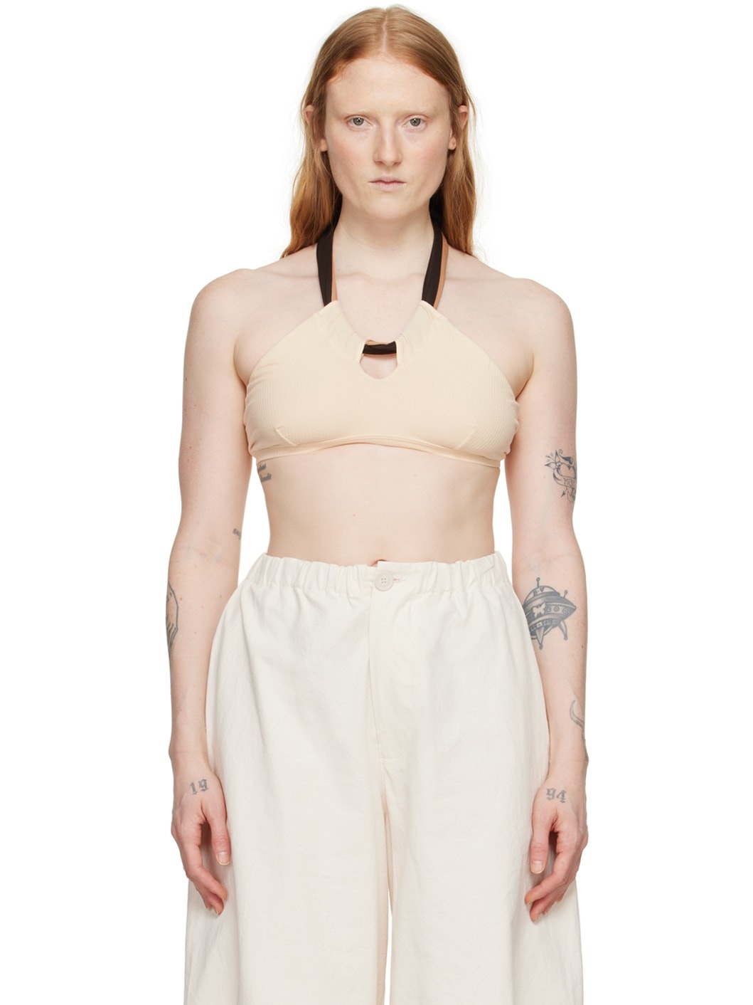 Stretch organic cotton ribbed jersey bra. GOTS-, OEKO-TEX®-, and OCS 100-certified. · Keyhole at chest · Dart at cups · Elasticized hem · Integrated deadstock self-tie halter straps · Fully lined Supplier color: Kano pink 91% organic cotton, 9% elastane. Made in Portugal 241922F073025