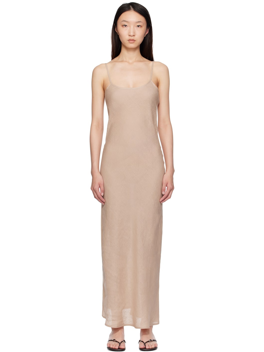 Bias-cut semi-sheer linen hopsack maxi dress. · OEKO-TEX®-certified · Scoop neck · Adjustable spaghetti straps Supplier color: Still brown 100% linen. Made in Turkey 251922F055009