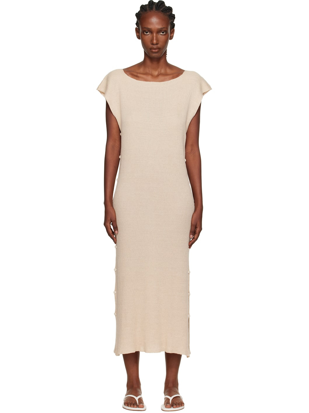 Rib-knit linen- and organic cotton-blend maxi dress. · OEKO-TEX®-certified · Boatneck · Button fastening at open side seams Supplier color: Lata beige 55% linen, 30% organic cotton, 15% seacell. Made in France 252922F055006