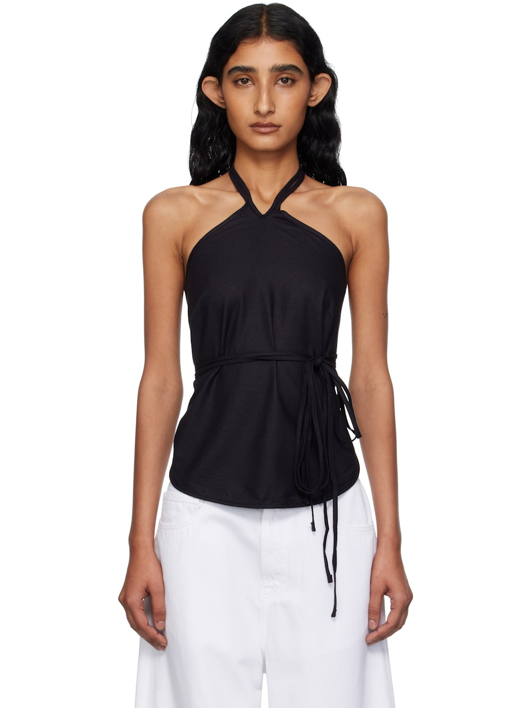 Plain-woven wild silk camisole. · Certified OEKO-TEX® · Self-tie halter strap · Wraparound self-tie fastening at open back Supplier color: Black 100% wild silk. Made in Turkey 252922F111033