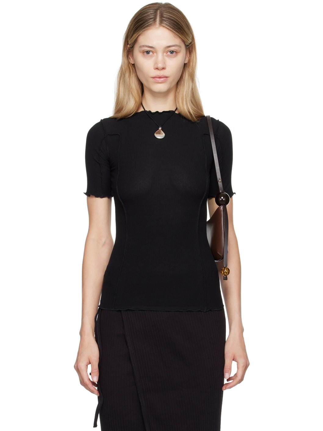 Stretch organic cotton ribbed jersey T-shirt. GOTS-, Oeko-Tex®-, and OCS 100-certified. · Exposed seams throughout · Lettuce edge at boat neck, hem, and cuffs Supplier color: Black 91% organic cotton, 9% elastane. Made in Portugal 242922F110000