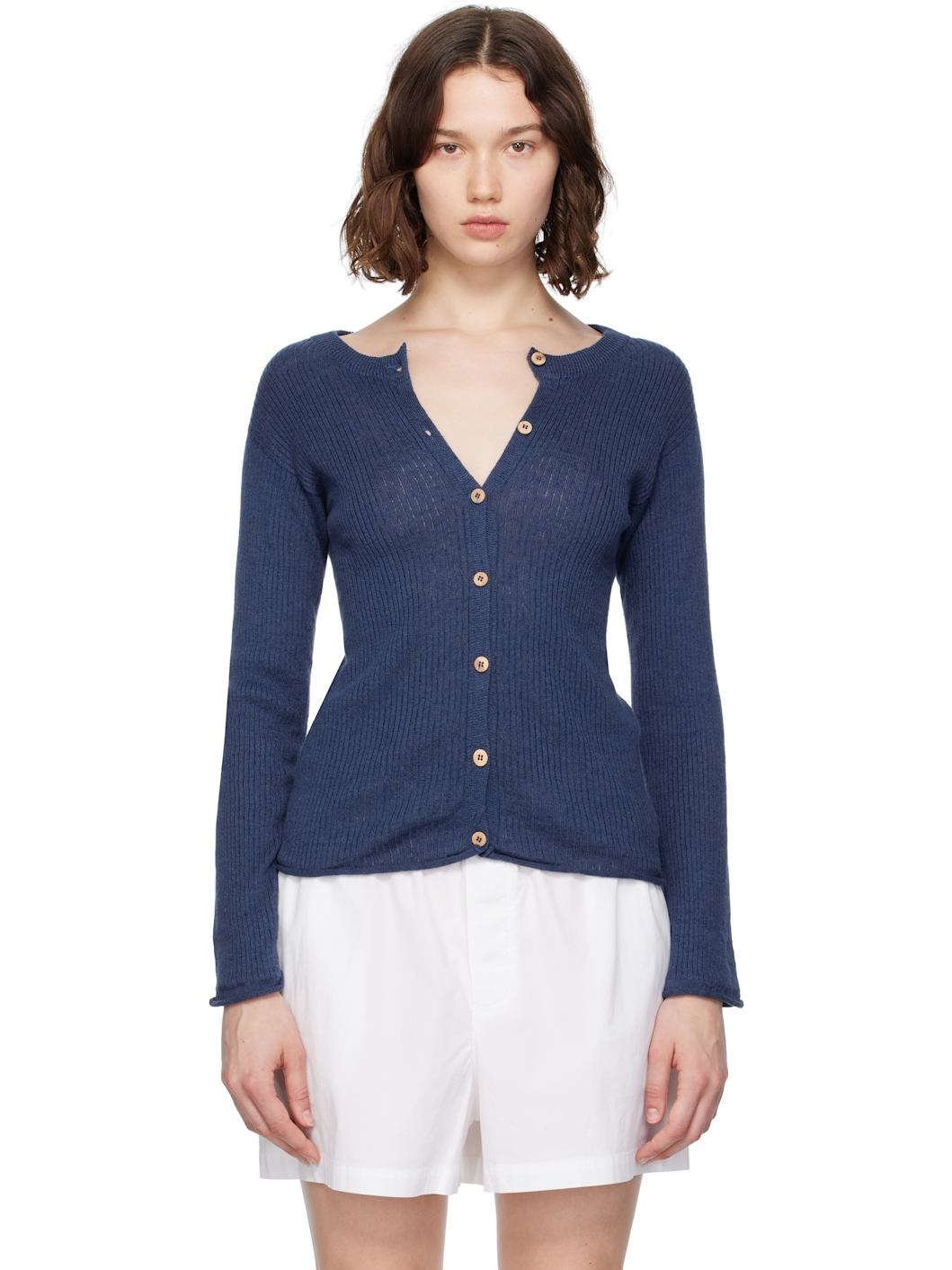 Rib-knit linen- and organic cotton-blend cardigan. · OEKO-TEX®-certified · Crewneck · Button closure · Rolled edge at hem and cuffs · Wood hardware Supplier color: Mez blue 55% linen, 30% organic cotton, 15% seacell. Made in France 251922F095005