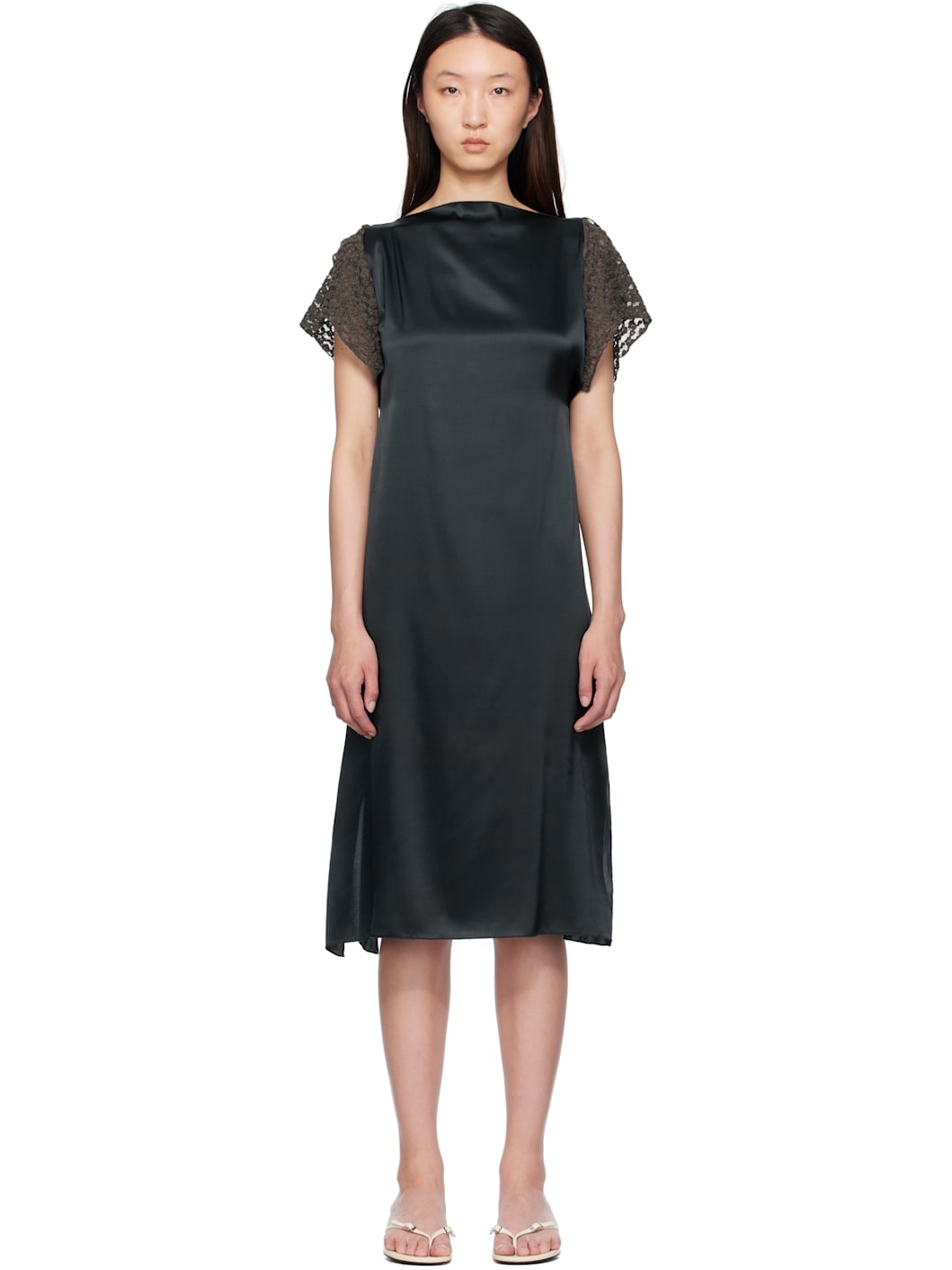 Stretch silk satin midi dress. · OEKO-TEX®-certified · Boatneck · Vented side seams · Slit at lace sleeves Supplier color: Arch blue/Dark brown Body 1: 96% silk, 4% elastane. Body 2: 46% organic cotton, 52% polyamide, 2% elastane. Made in Turkey 251922F054006