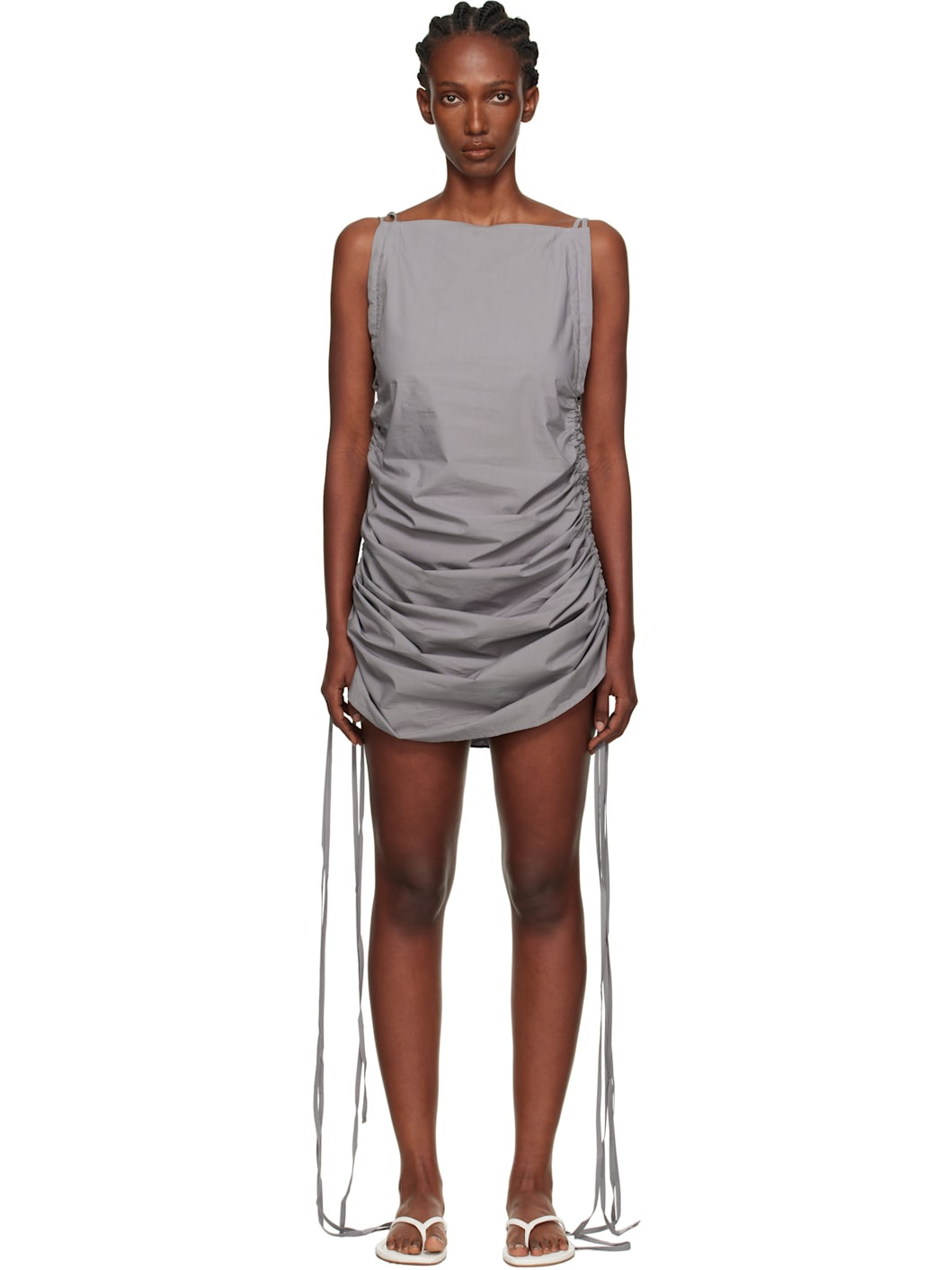 Organic cotton poplin midi dress. · GOTS-, OEKO-TEX®-, and OCS 100-certified · Boatneck · Ruching and self-tie straps at side seams · Adjustable shoulder straps Supplier color: Ziti grey 100% cotton. Made in Turkey 252922F055000