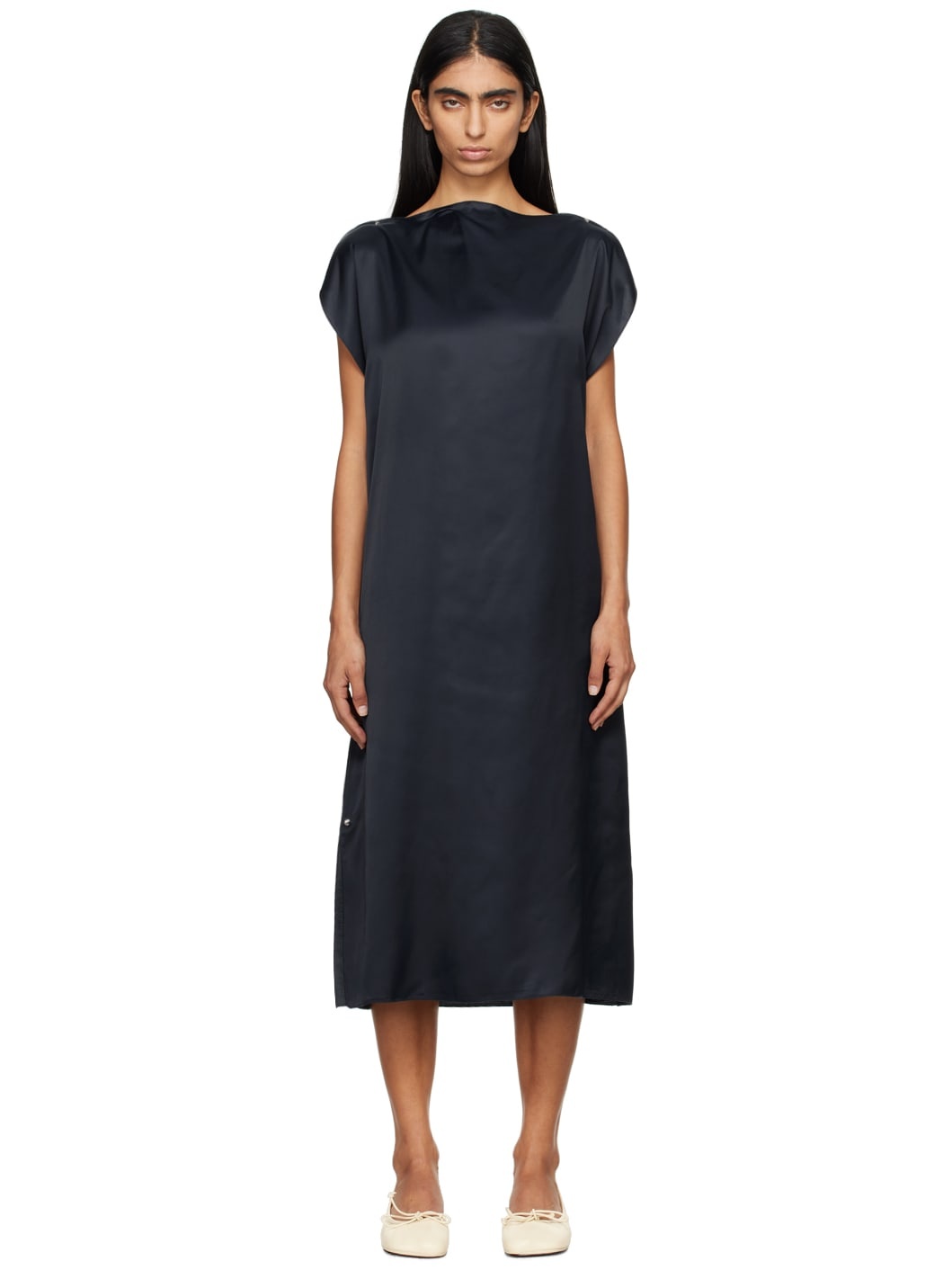 FSC- and PEFC-certified Ecovero™ viscose satin midi dress. Rivets throughout. · Boat neck · Vent at side seams Supplier color: Blue black 100% viscose. Made in Turkey 242922F054013