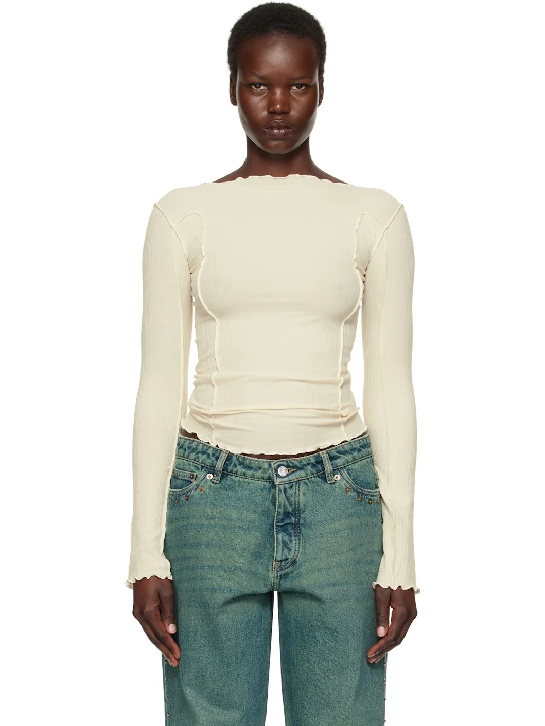 Stretch organic cotton ribbed jersey T-shirt. Exposed seams throughout. · GOTS-, Oeko-Tex®-, and OCS 100-certified · Lettuce edge at boat neck, hem, and cuffs Supplier color: Off white 91% organic cotton, 9% elastane. Made in Portugal 251922F110013