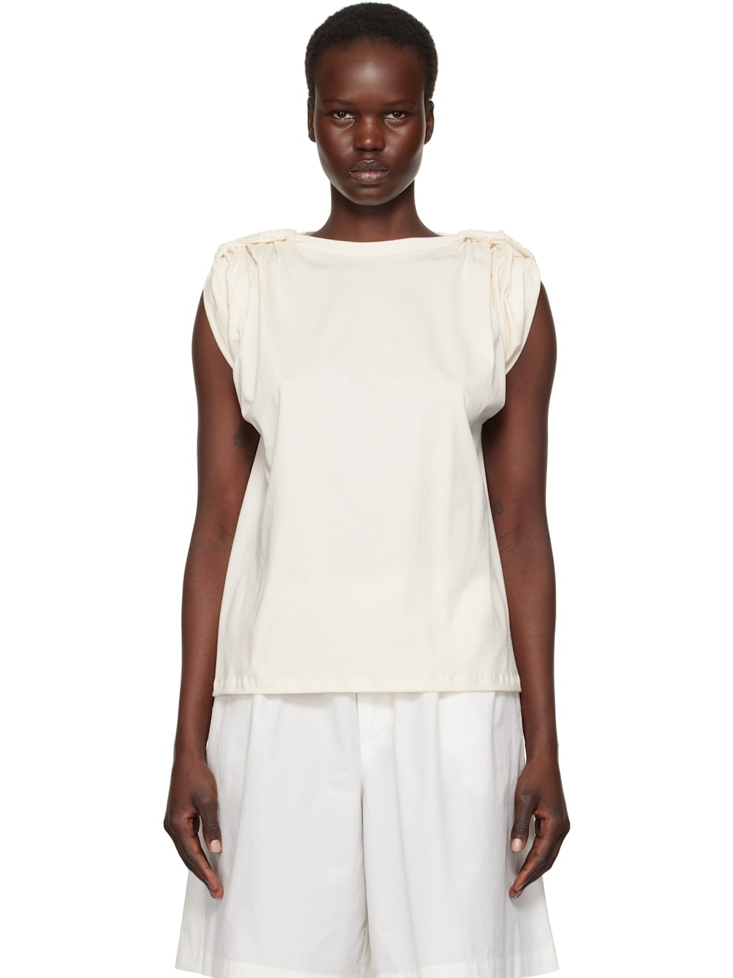 Organic cotton jersey T-shirt. GOTS-, OEKO-TEX®-, and OCS 100-certified. · Rib-knit crewneck · Gathering and lace fastening at modified cap sleeves Supplier color: Undyed 100% organic cotton. Made in Portugal 251922F110018