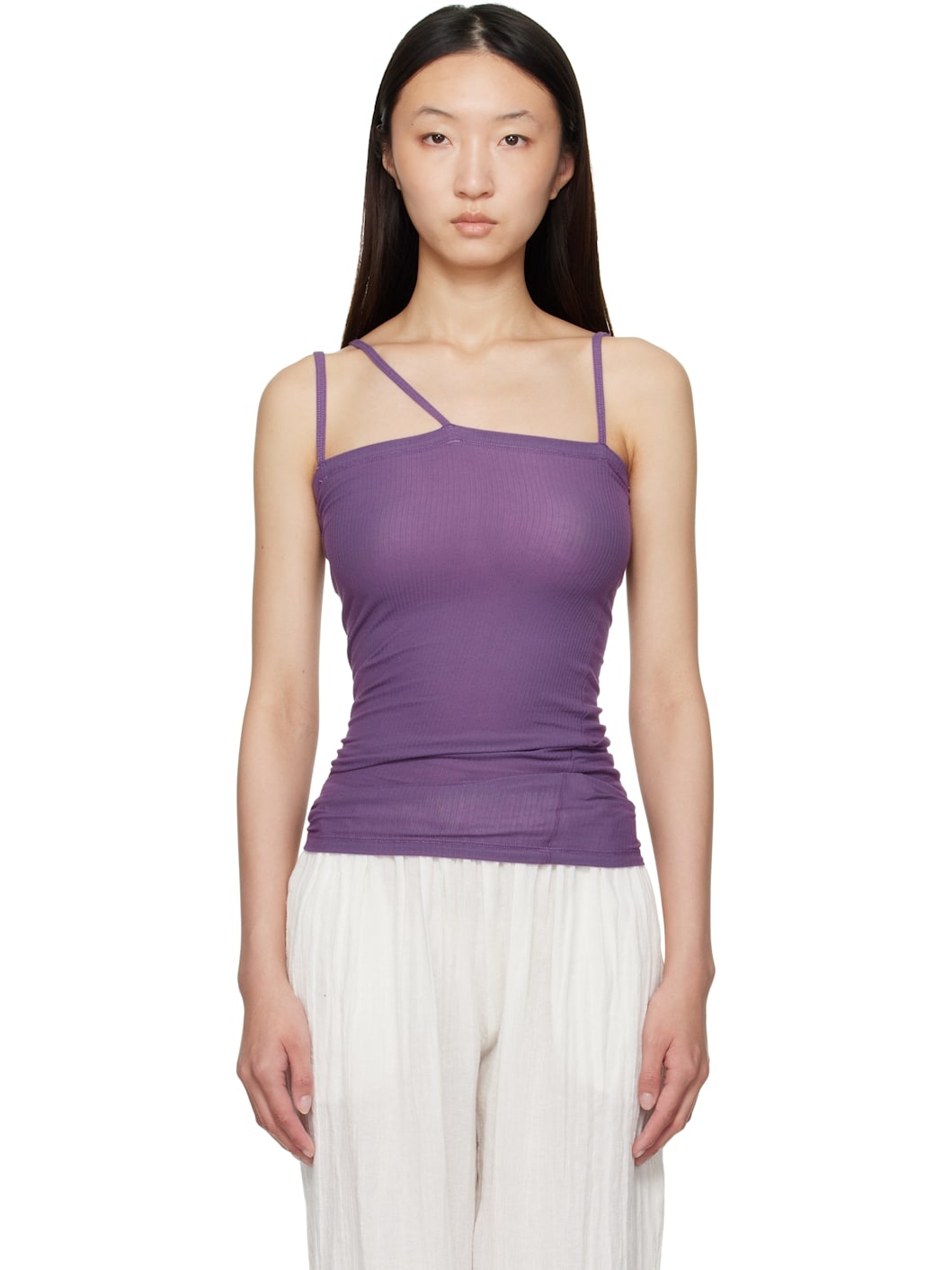 Ribbed stretch organic cotton jersey tank top. · GOTS-, OEKO-TEX®-, and OCS 100-certified · Asymmetrical strap at straight neck · Fixed spaghetti straps Supplier color: Venet purple 91% organic cotton, 9% elastane. Made in Portugal 252922F111007