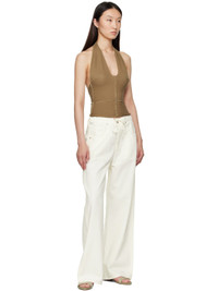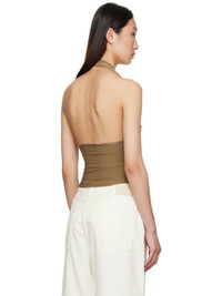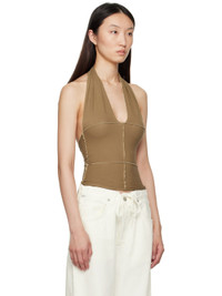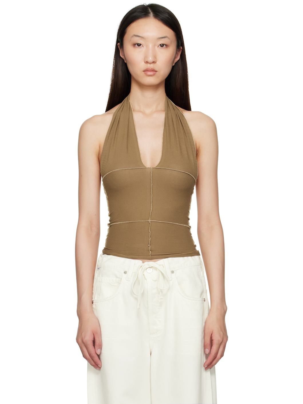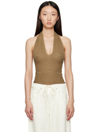 Rib-knit stretch organic cotton top. Exposed seams throughout. · GOTS-, OEKO-TEX®-, and OCS 100-certified · Paneled construction · Lettuce edge at hem · Fixed halter strap · Open back Supplier color: Alamillo brown 91% organic cotton, 9% elastane. Made in Portugal 251922F111031