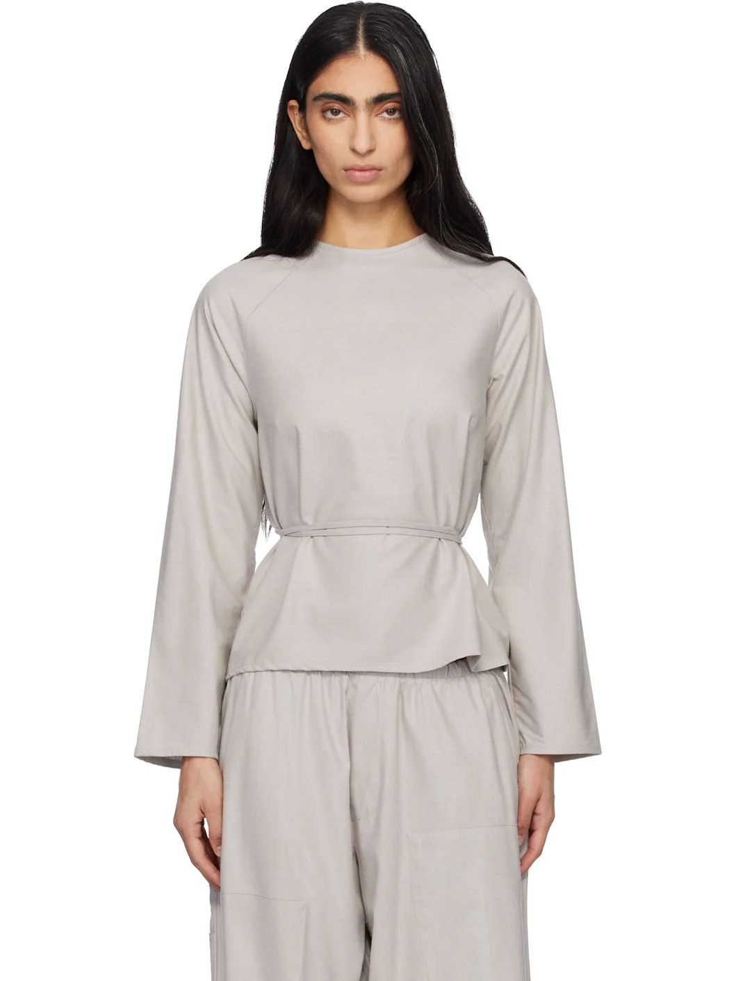 OEKO-TEX®-certified wild silk noil top. · Wrap construction · Self-tie fastening at neck and waist · Raglan sleeves · Open back Supplier color: Prun Grey 100% wild silk. Made in Turkey 261922F110030