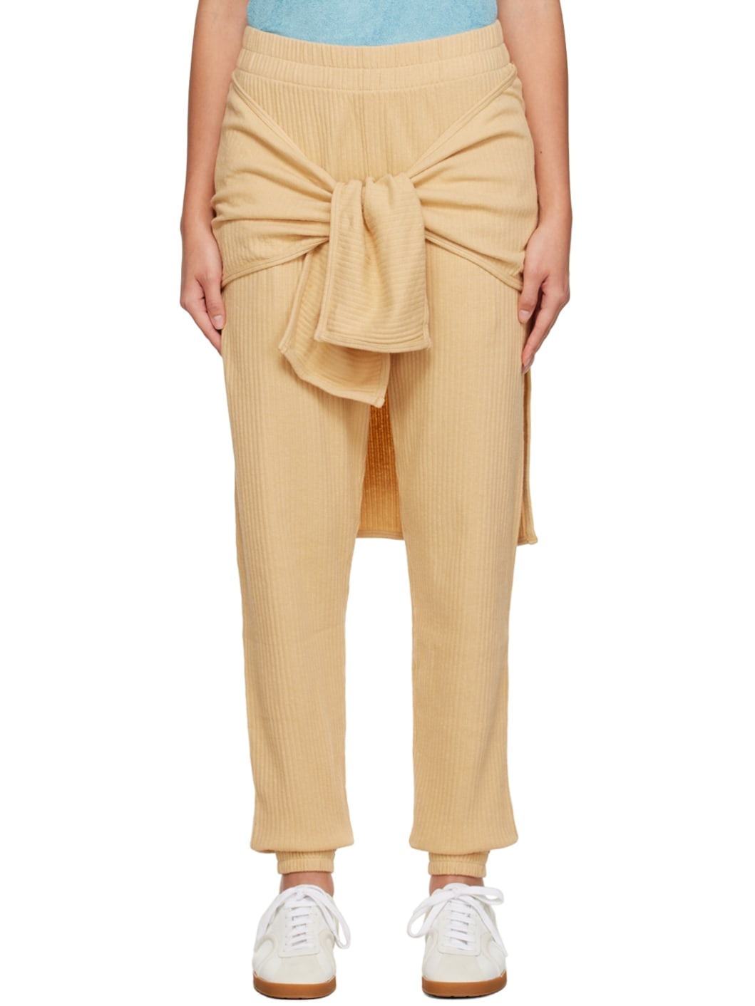 Rib knit organic cotton- and hemp-blend pants. GOTS-, OEKO-TEX®-, and OCS 100-certified. · Layered construction · Elasticized waistband and cuffs · Two-pocket styling · Self-tie straps at waist for alternate styling Supplier color: Dust beige 85% organic cotton, 15% hemp. Made in Portugal 232922F086013
