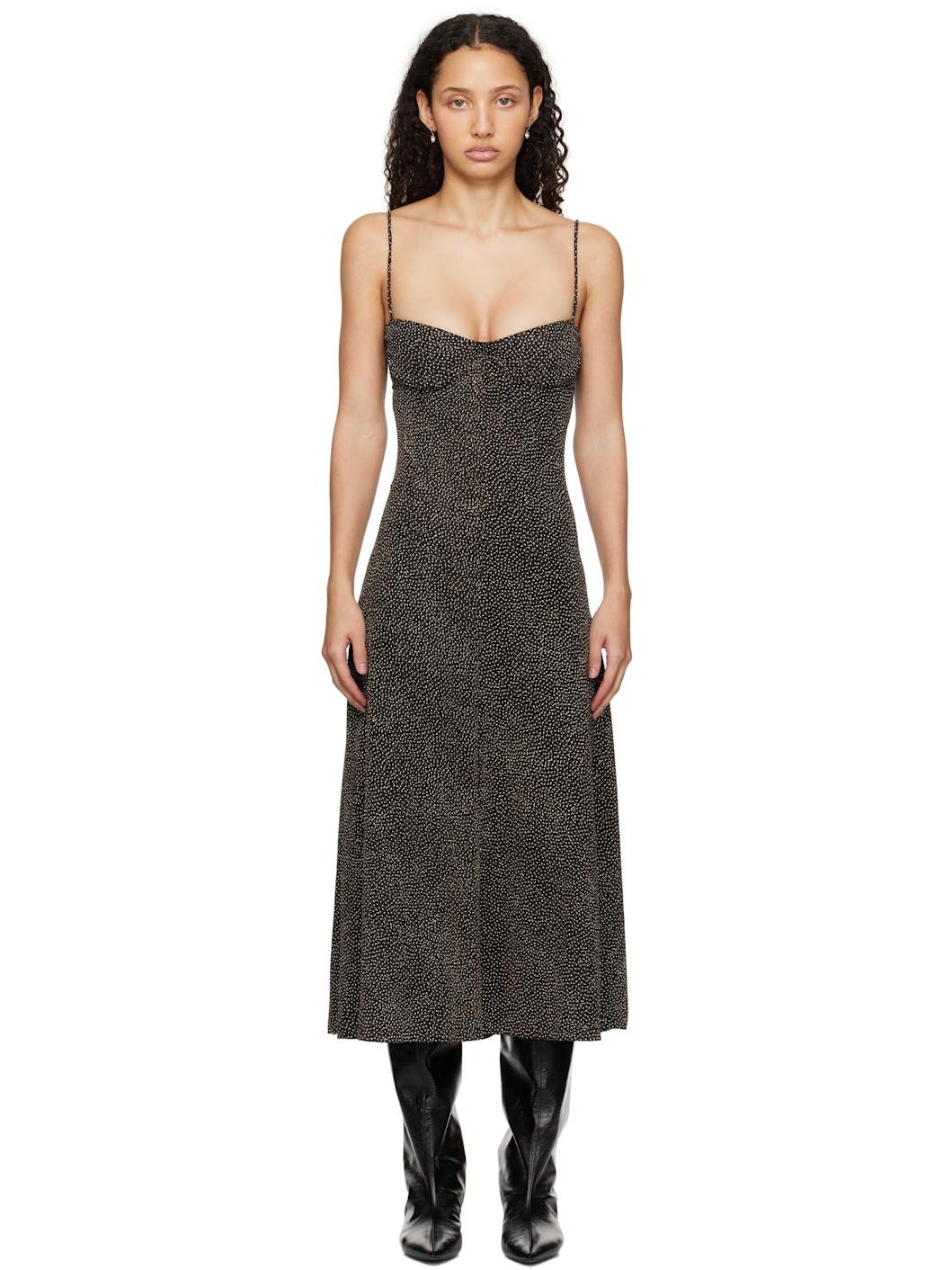 Rib-knit stretch nylon midi dress. Polka dot pattern and metallic thread detailing throughout. · Sweetheart neck · Underwire at cups · Adjustable spaghetti straps · Unlined Supplier color: Black/Gold 92% nylon, 5% spandex, 3% metallic fibre. Made in Portugal 251868F054002