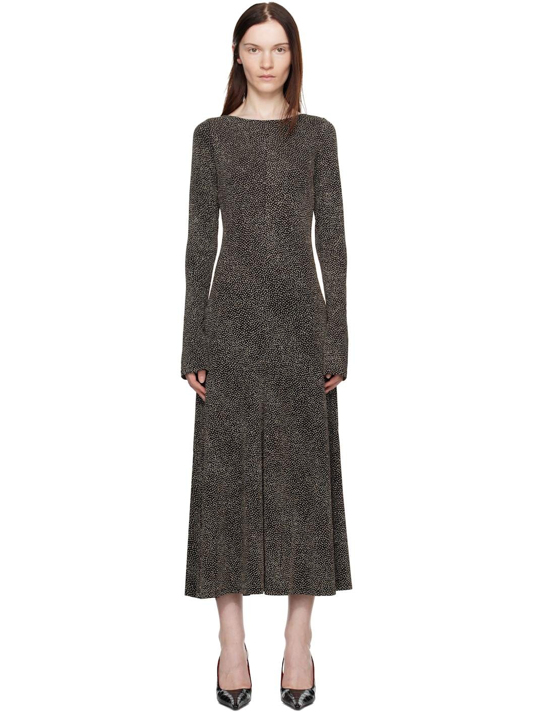 Semi-sheer plain-woven stretch nylon-blend maxi dress. Metallic thread detailing throughout. · Round neck · Flared hem · Slit at cuffs · Open back Supplier color: Black/Gold 92% nylon, 5% spandex, 3% metallic fibre. Made in Portugal 251868F055003