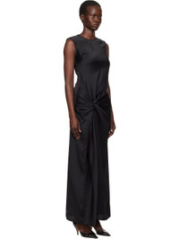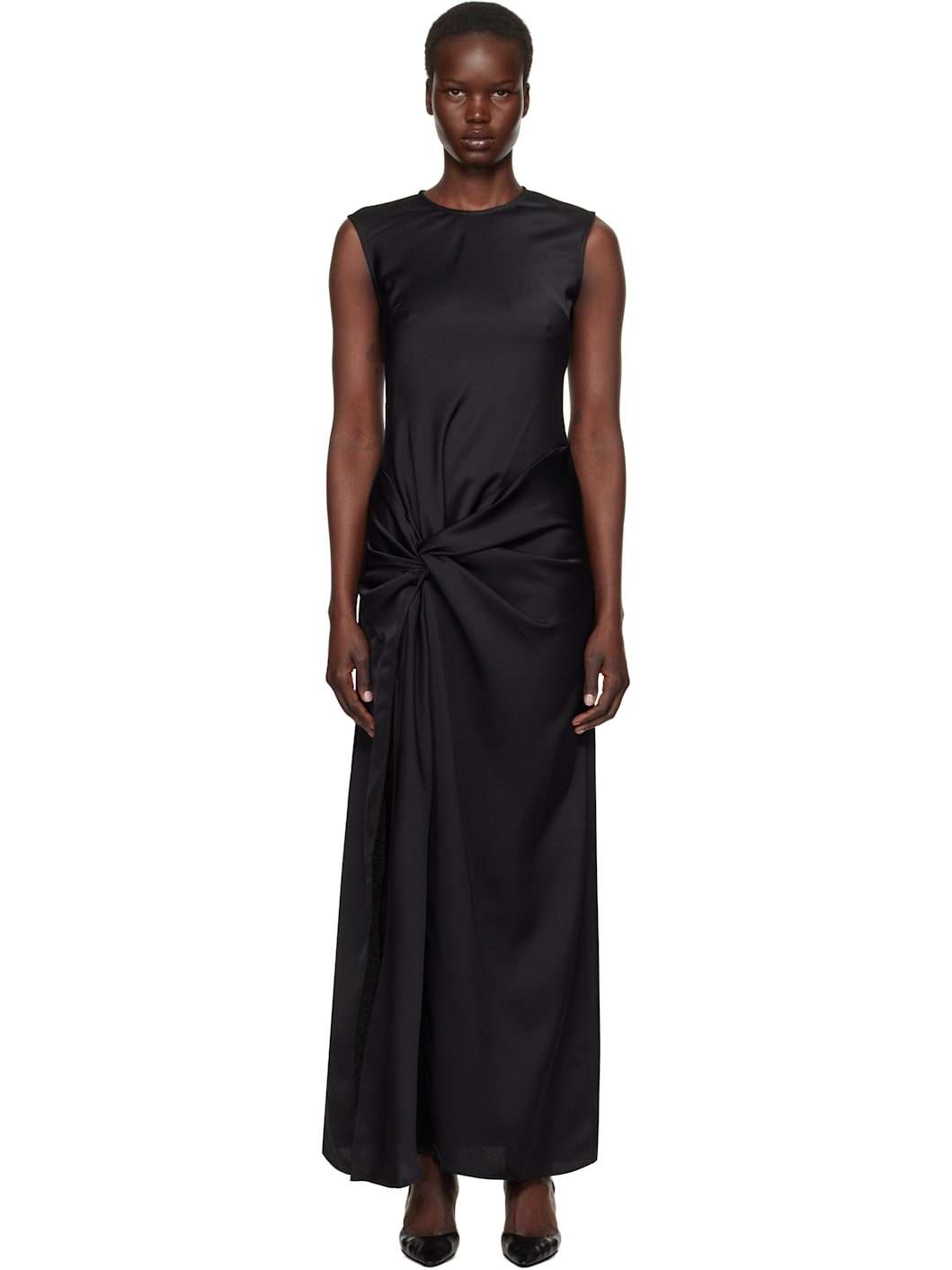 Recycled polyester satin maxi dress. Draping throughout. · Round neck · Darts at chest · Slit at hem · Twisted detailing at side seam · Concealed zip closure at back · Unlined Supplier color: Black 100% recycled polyester. Made in Portugal 251868F055001