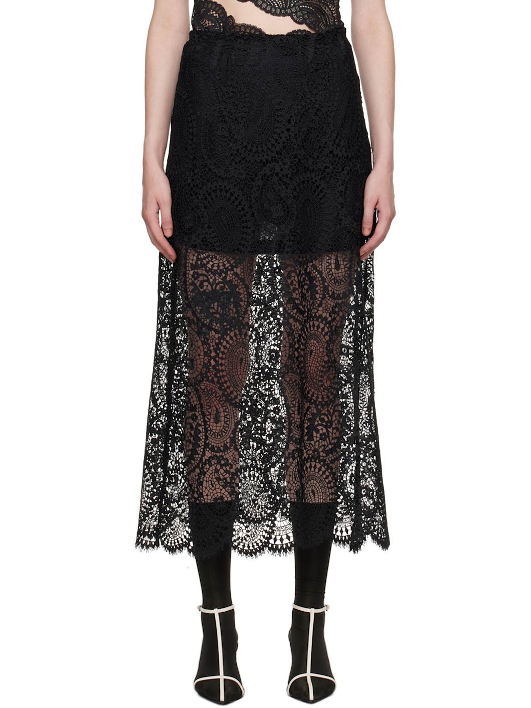 Sheer polyester lace skirt. Paisley pattern throughout. · Belt loops · Scalloped edge at hem · Concealed zip closure at side seam · Detachable stretch nylon jersey slip Available exclusively at SSENSE. Supplier color: Black Body: 100% polyester. Lining: 90% polyamide, 10% elastane. Made in Portugal 242868F092002