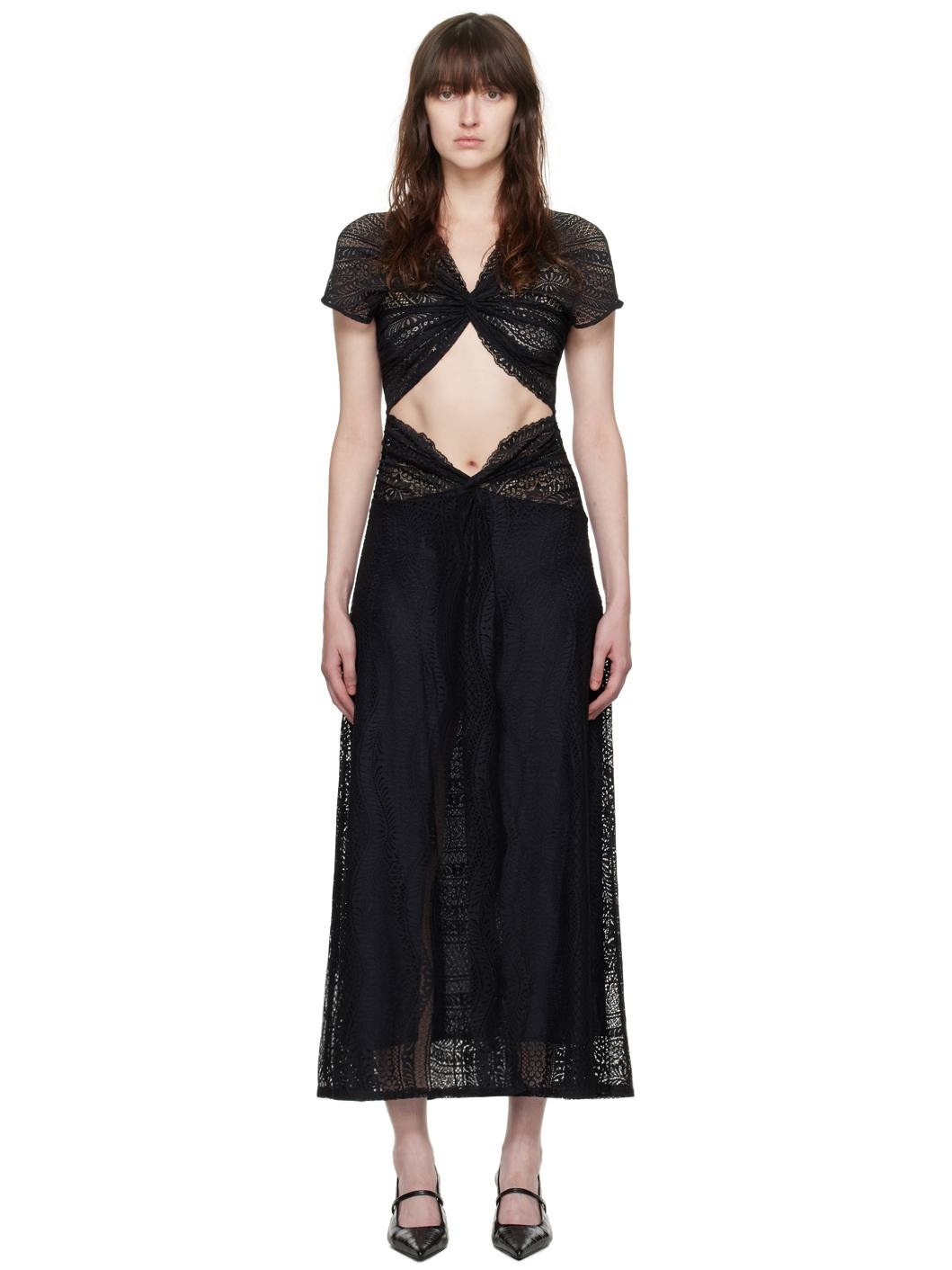 Semi-sheer stretch nylon-blend lace dress. Gathering, floral pattern, and scalloped edges throughout. · Twisted detailing at V-neck · Cutout at waist · Vent at front hem · Elasticized cuffs · Partial stretch nylon voile lining Available exclusively at SSENSE. Supplier color: Black Body: 90% polyamide, 8% spandex, 2% rayon. Lining: 90% polyamide, 10% elastane. Made in Portugal 242868F054000