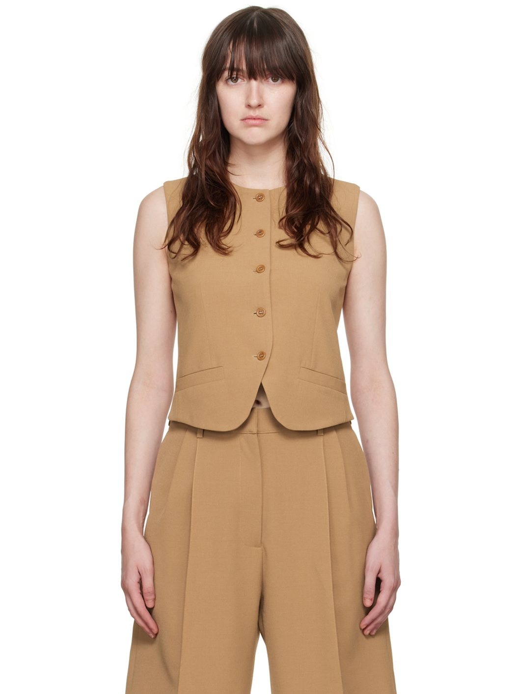 Stretch polyester- and viscose-blend barathea vest. · Round neck · Button closure · Darts at front · Welt pockets · Cinch strap at back · Full cupro- and viscose-blend satin lining Available exclusively at SSENSE. Supplier color: Camel Body: 68% polyester, 29% viscose, 3% elastane. Lining: 50% cupro, 50% viscose. Made in Portugal 242868F068000