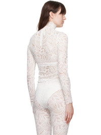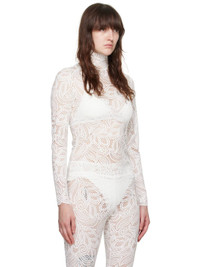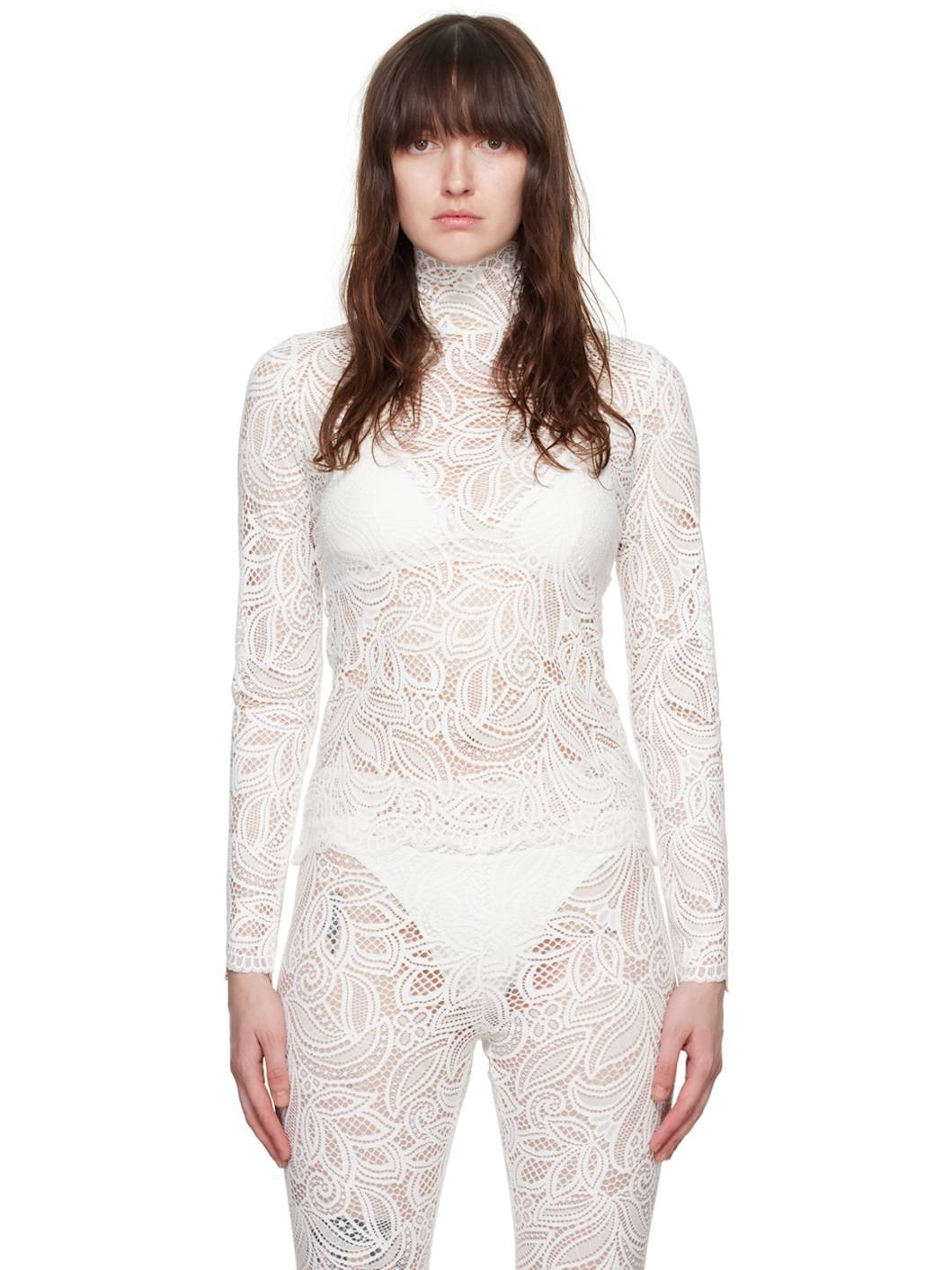 Sheer stretch nylon-blend lace blouse. Floral pattern and scalloped edges throughout. · Turtleneck · Concealed zip closure at back Supplier color: White 90% polyamide, 8% spandex, 2% rayon. Made in Portugal 242868F107000