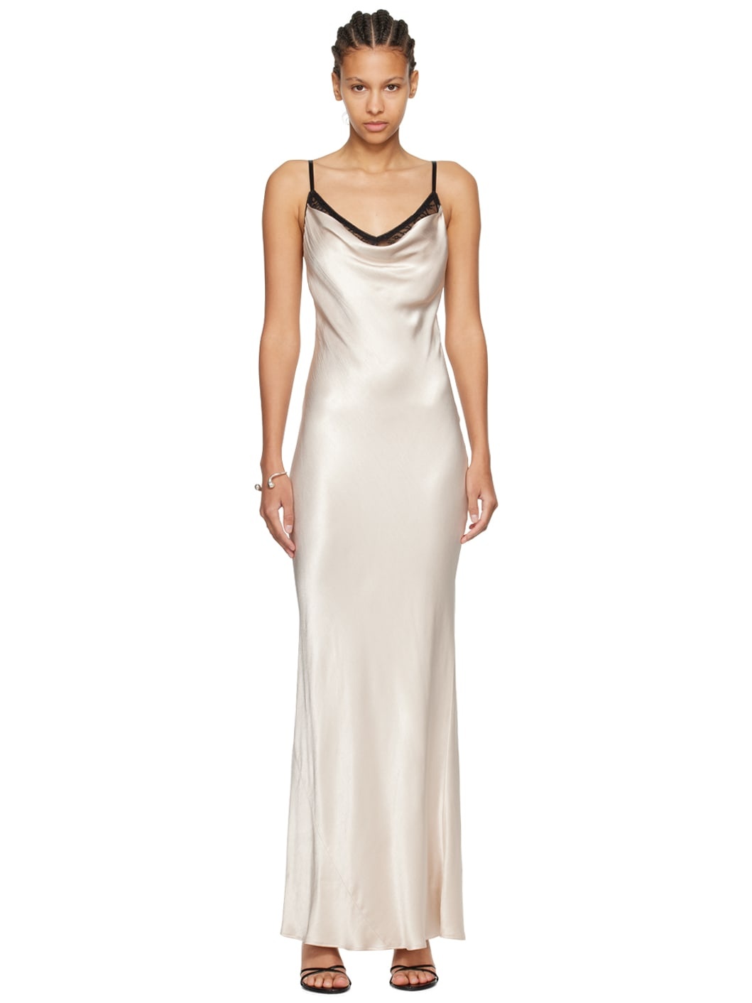 Bias-cut viscose charmeuse dress. Stretch nylon lace bra-style underlay. · Layered construction · Cowl neck · Adjustable spaghetti straps · Hook-eye fastening at open back Supplier color: Sand/Black Body: 100% viscose. Trim: 89% nylon, 11% elastane. Made in Australia 241880F055038