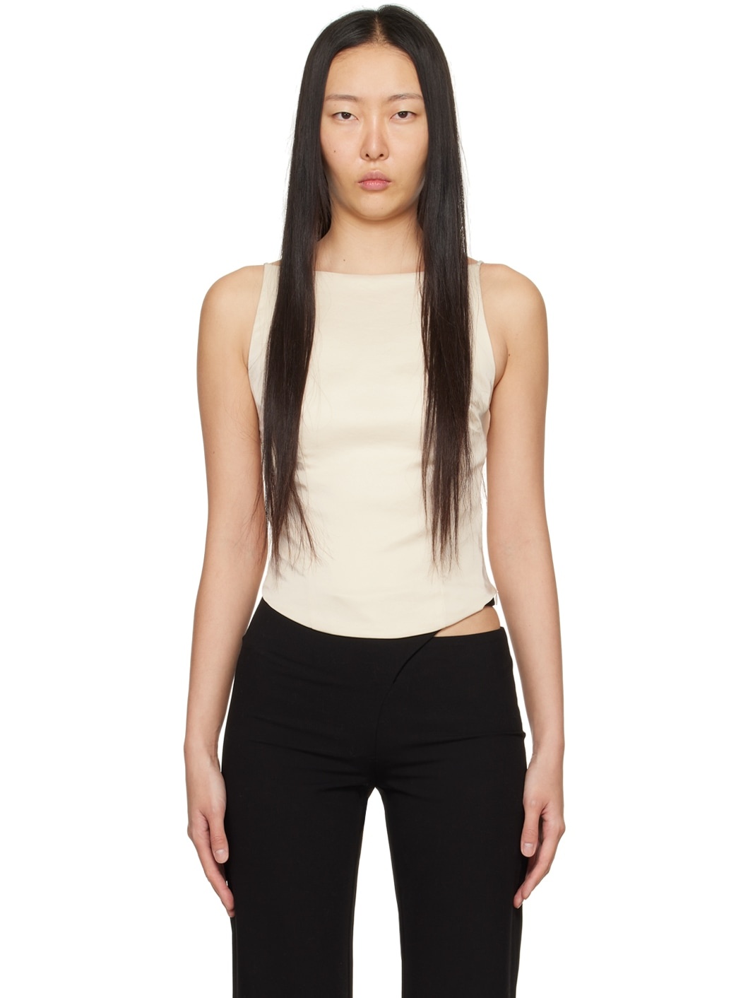 Recycled polyester-blend satin tank top. · Boat neck · Darts at front · Zip closure and ruching at side seam · Fixed shoulder straps · Fully lined Supplier color: Vanilla bean 69% polyester, 31% recycled polyester. Made in Australia 241880F111000
