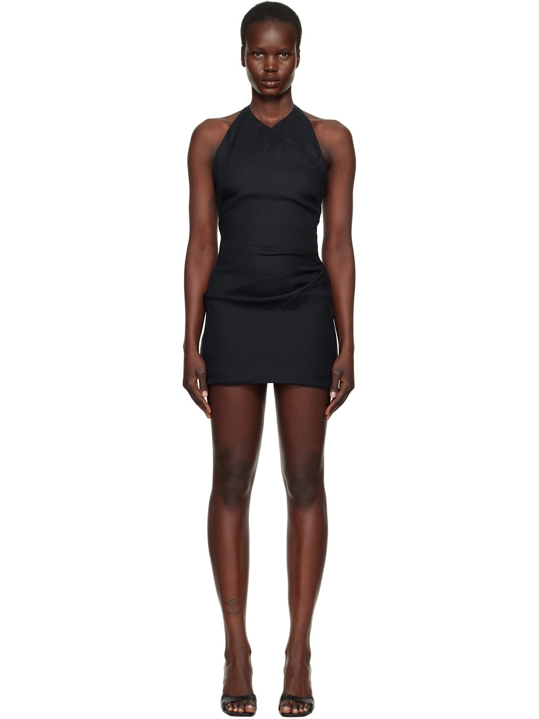 Plain-woven linen minidress. · V-neck · Gathering at side seams · Hook-eye halter strap · Zip closure at open back Supplier color: Black Body: 100% linen. Lining: 100% cotton. Made in Australia 251880F052005