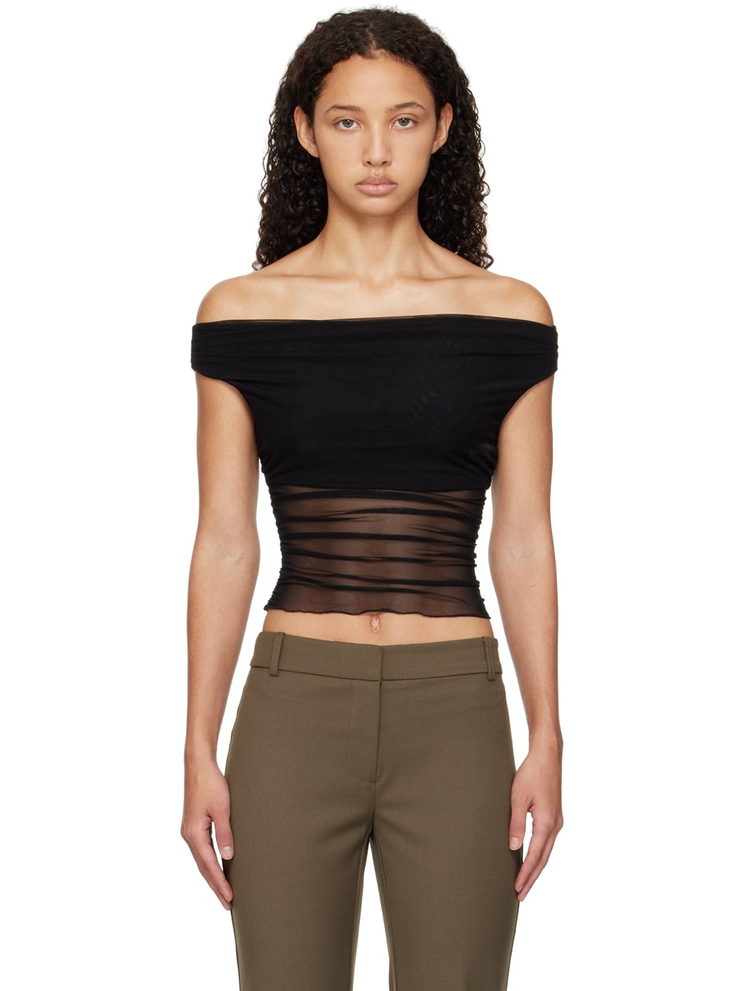 Semi-sheer stretch nylon mesh tank top. · Off-the-shoulder construction · Lettuce edge at hem · Gathering at side seams Supplier color: Black 94% nylon, 6% elastane. Made in Australia 242880F111002