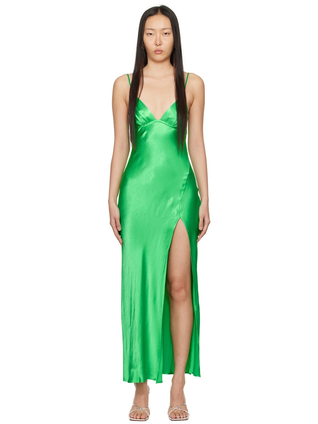 Bias-cut viscose crepe-back satin dress. · V-neck · Vented side seam · Adjustable spaghetti straps · Self-tie fastening at low back Supplier color: Emerald 100% viscose. Made in Australia 241880F055018