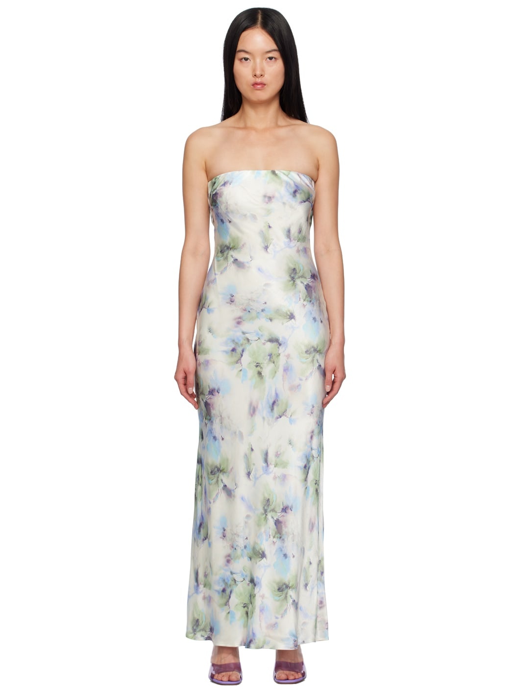 Bias-cut viscose hammered satin dress. Floral pattern printed throughout. · Strapless construction · Elasticized straight neck · Darts at chest · Hook-eye strap at low back · Draping at back · Unlined Supplier color: Watercolour floral 100% viscose. Made in Australia 241880F055030