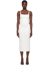 Lightweight stretch viscose-blend twill midi dress. · Square neck · Darts at front · Gathering at side seam · Raw edge hem · Low back · Fully lined Supplier color: White Body: 58% viscose, 38% nylon, 4% elastane. Lining: 95% polyester, 5% elastane. Made in Australia 251880F054000