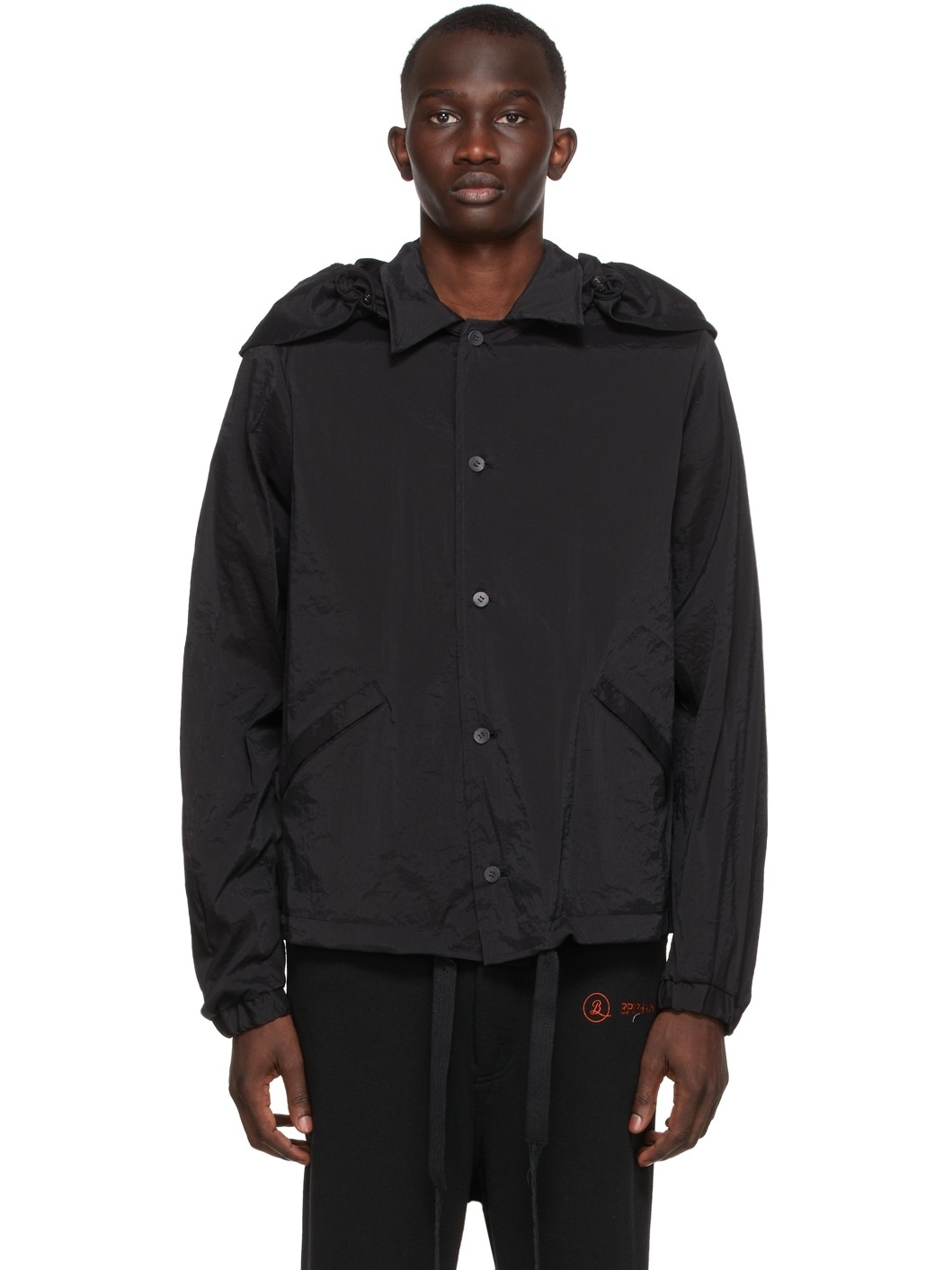 Long sleeve crinkled nylon-blend canvas jacket in black. · Bungee-style drawstring at detachable hood · Button closure at front · Welt pockets at waist · Drawstring at distressed hem · Unlined · Tonal leather and oxidized hardware Supplier color: Black