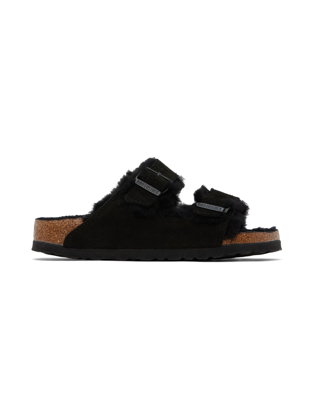 Suede slip-on flat sandals in black. · Open toe · Adjustable pin-buckle straps at vamp · Logo embossed at inner side · Logo patch at molded footbed · Shearling lining · Cork midsole · Treaded EVA rubber sole Supplier color: Black Upper: leather. Sole: rubber. Made in Germany 241513F124010